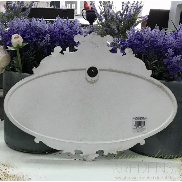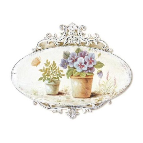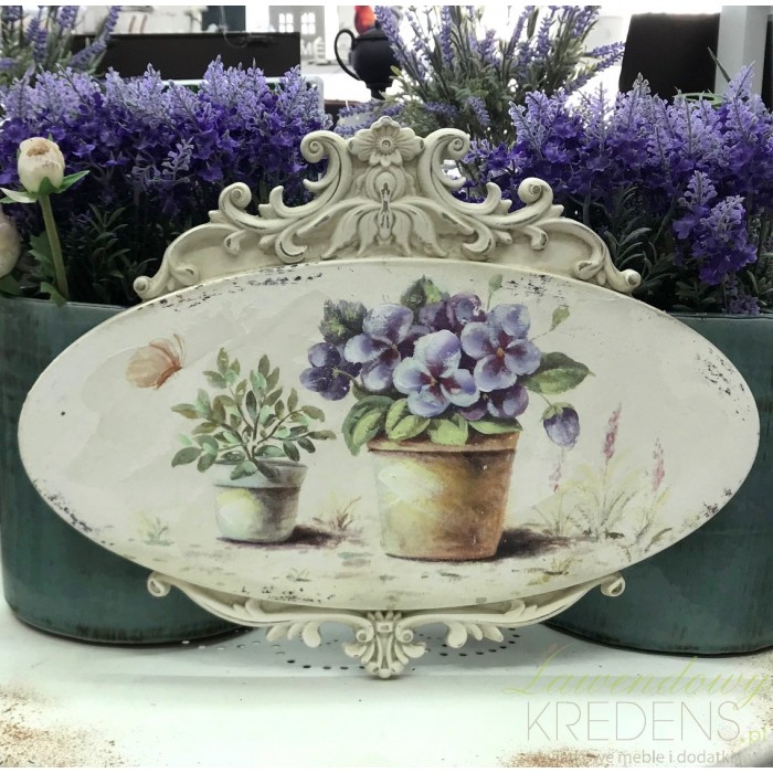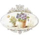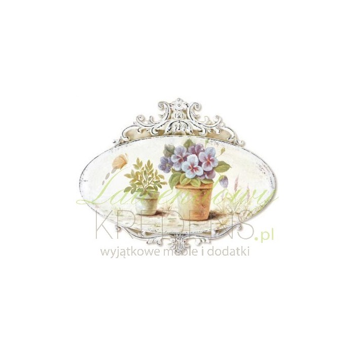 Owalny obraz z dekorem przedstawia dwie donice z kwiatem stojące obok siebie na trawiastym podłożu.