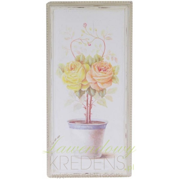 Spotkaj się ze swoimi znajomami we wnętrzu, o którego oprawę zadba styl prowansalski za sprawą pięknych dekoracji. Polecamy Ci obrazy w stylu prowansalskim od włoskiej marki. Wąski i wysoki obraz przedstawiający kolorowe kwiaty róż w donicy jest oprawiony w drewnianą ramę. Obrazy w stylu prowansalskim z tej kolekcji mają postarzane ramy i pastelowe kolory.