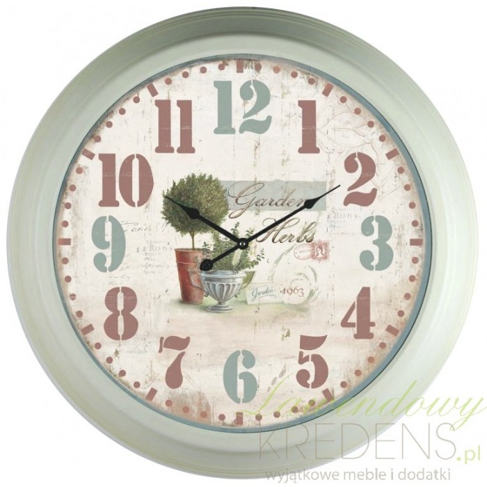 Styl prowansalski kojarzy się z jasną kolorystyką, motywem lawendy, słońcem oraz klimatem wakacyjnym. Taki właśnie jest metalowy zegar prowansalski z naszej kolekcji. Zegar ma okrągła tarczę i pastelowe kolory. Elementem, który go wyróżnia jest tło tarczy, czyli namalowany ogród w klimacie Prowansji oraz duże arabskie cyfry. Zegary ścienne pozwolą skontrolować aktualny czas!