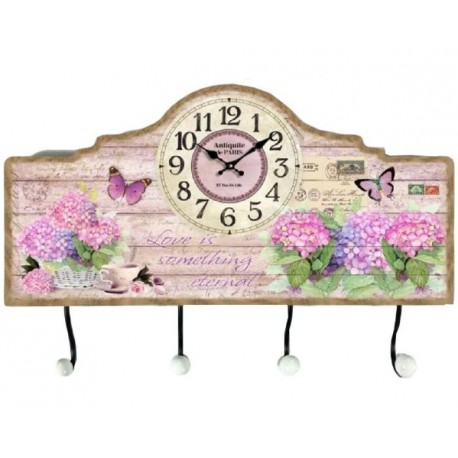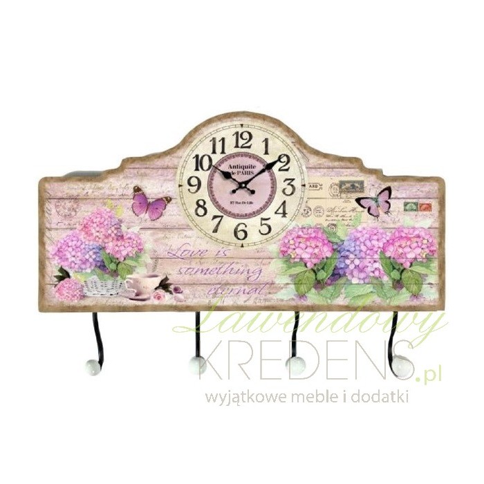 Piękne wieszaki w stylu prowansalskim z wbudowanymi zegarkami to łatwy sposób na ozdobienie wnętrza. Wszystko dzięki kolorowemu wzornictwu, na którym przeważa motyw hiacyntów i dwóch motylków. Ozdobna tablica wieszaka została wykonana z mdf, a cztery wieszaczki z metalu zakończonego ceramicznymi gałkami.