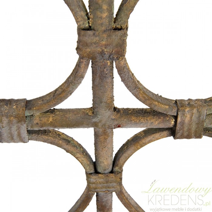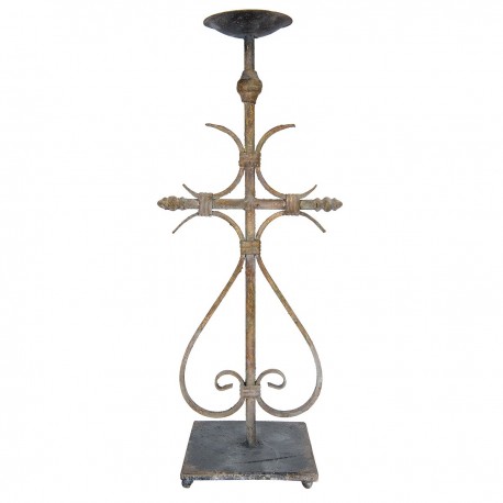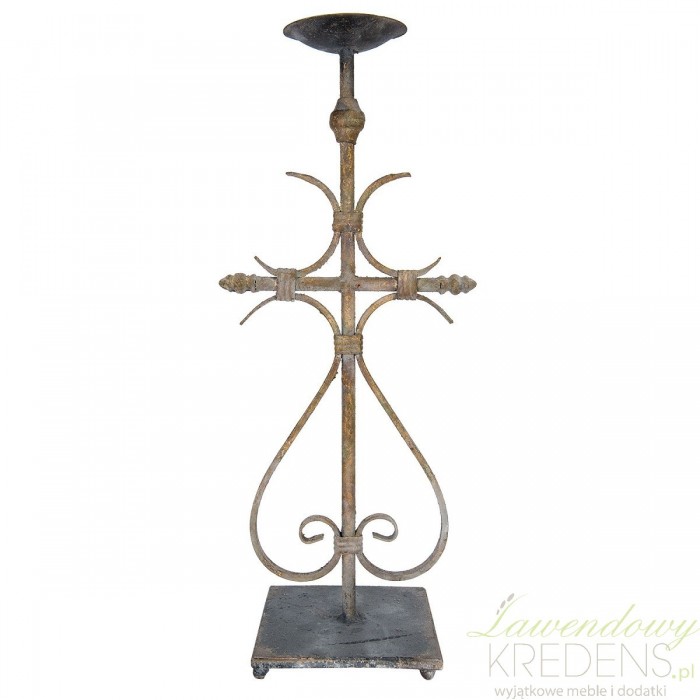 Świecznik w stylu prowansalskim wykonany jest z metalu i jest mocno postarzany. Wysoki świecznik firmy Clayre & Eef ma kolor szary i brązowy. Przypomina krzyż otoczony cudownymi, finezyjnymi liniami.