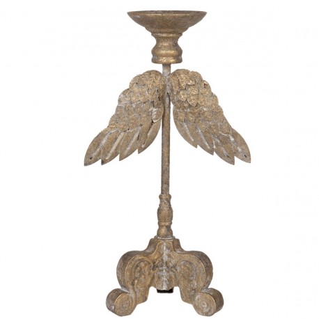 Złoty świecznik Clayre & Eef posiada postarzaną stylizację oraz ozdobny kształt skrzydełek, który przykuje uwagę wszystkich gości. Dodatki do domu z naszej oferty to produkty piękne i funkcjonalne.