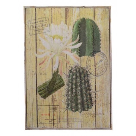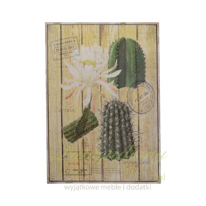 Obraz z kaktusami przedstawia kombinację trzech różnych kaktusów i białego kwiata. Tło obrazu wygląda jak zbite ze sobą stare deski oprawione prostą ramką. Obraz jest postarzany o czym świadczy przecierana ramka oraz zanikające napisy i pieczęcie. Wybierz ciekawe obrazy z kaktusami i stwórz egzotyczny aranż!