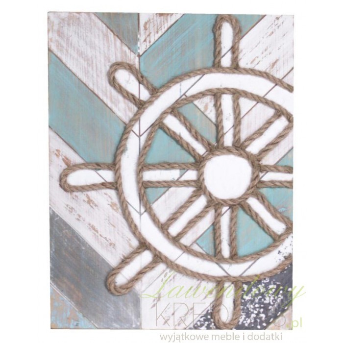 Obraz marynistyczny z kołem sterowym wykonanym ze sznura to oryginalna ozdoba wpisująca się w obecne trendy wyposażenia wnętrza.