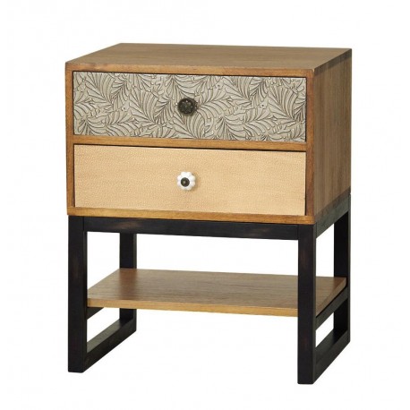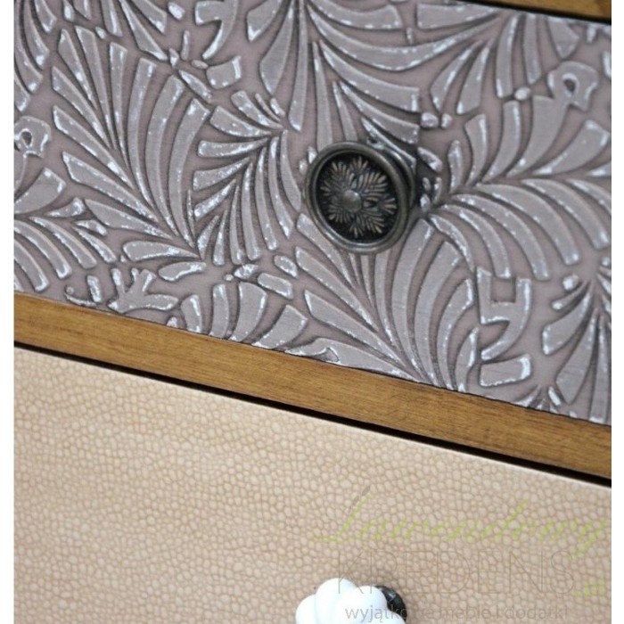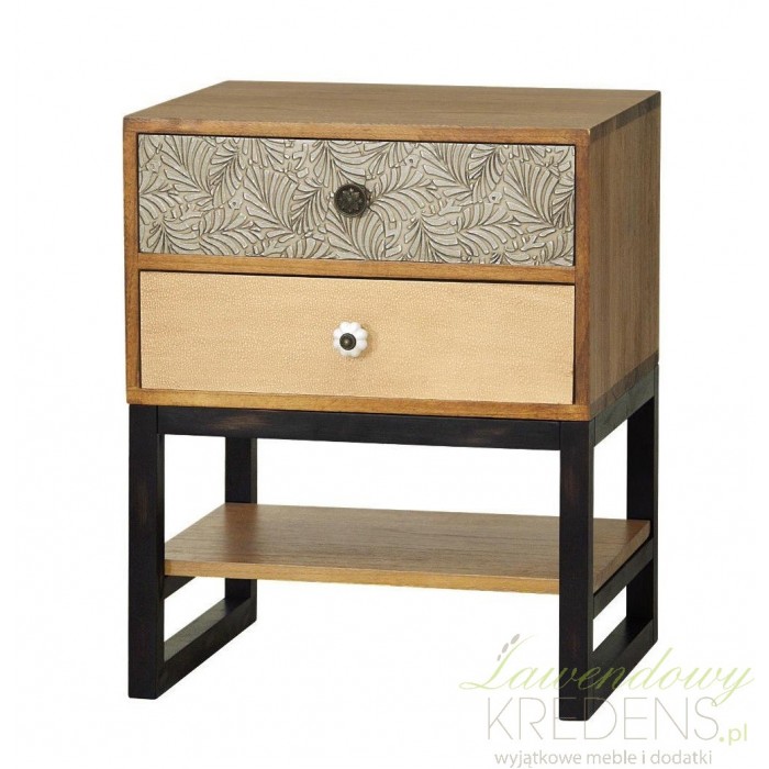 Szafka Portogrande w stylu retro to mebel z charakterystycznymi szufladami i półką. Górna szuflada zdobiona liściastym wzorem posiada czarną gałkę, z kolei dolna szuflada w jasnym kolorze brązu ma gałkę w kolorze bialym, w kształcie kwiata. Meble w stylu retro od marki Livin Hill doskonale wpasują się do sypialni, szafka może służyć jako stolik nocny. Wykorzystaj jego wszystkie możliwości i stwórz nieszablonową aranżację.