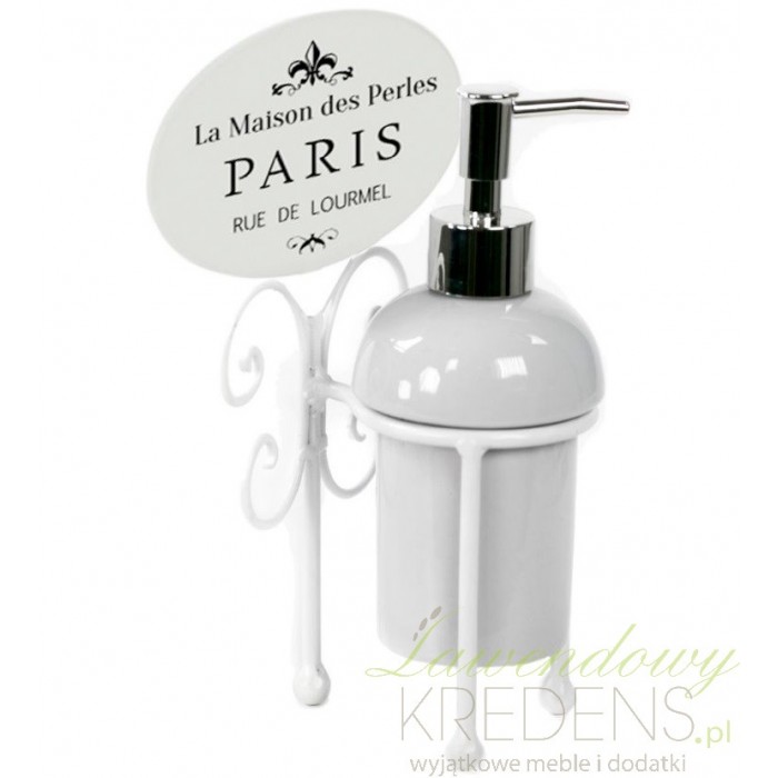 Dozownik do mydła wykonany jest z ceramiki i umieszczony w metalowym koszyku. Koszyk i ceramiczny dozownik są pomalowane na biało. Francuskie napisy na owalnej tabliczce jeszcze bardziej podkreślą piękno i wytworność twojej łazienki. Dodatki do łazienki i styl francuski tworzą wysmakowane połączenie.