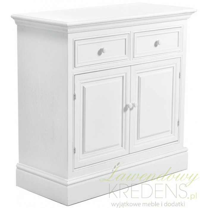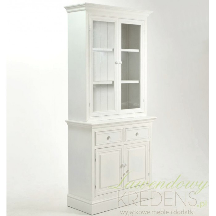 Komoda prowansalska ma śliczny biały kolor. Biała komoda wykonana jest z wysokiej jakości drewna i płyty MDF. Składa się z dwóch części: pierwsza to szklana otwierana szafka z trzema półeczkami, a druga to zamykana szafka i dwie szufladki. Idealnie nadaje się do kuchni, jako miejsce na zastawę stołową i sztućce. Meble prowansalskie to coś czego szukasz.