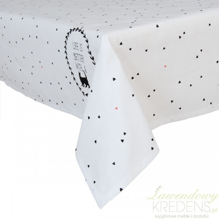 Obrus z kotami ma kształt prostokąta i wymiar 150x250cm. To duży obrus, którym z powodzeniem okryjesz duży stół w jadalni.Wzór na białym obrusie to koty i drobne serduszka w kolorze czarnym i różowym. Wybierając dla swojego wnętrza dekoracje od marki CLayre&Eef takie jak obrusy z kotami, zapewniasz sobie i całej rodzinie radosną atmosferę.