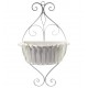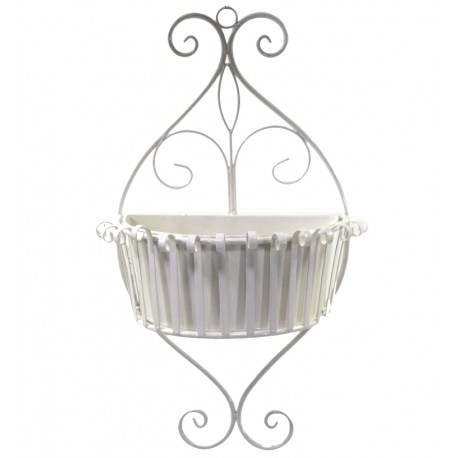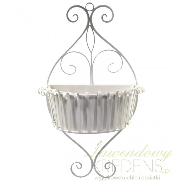 Wiszący kwietnik ścienny wykonany jest w całości z metalu i pomalowany na biało. Jego dekoracyjna część to pionowe uformowania i finezyjne gięcia metalu podkreślające styl prowansalski. Kwietnik ścienny możesz również zamontować na tarasie lub na balkonie. Doskonały w połączeniu z zwisającymi kwiatami.