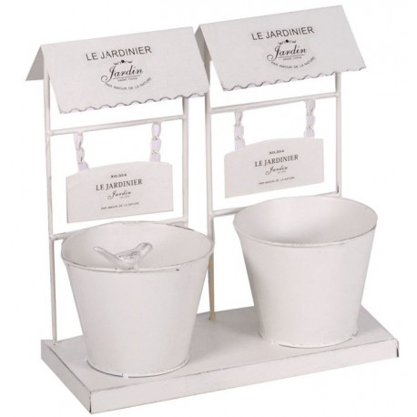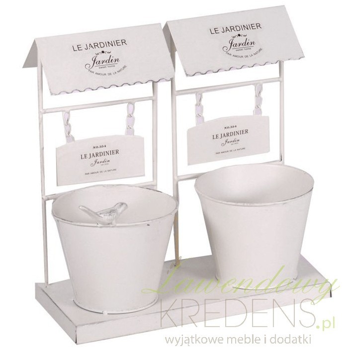 Dwie osłonki na doniczki zostały uroczo ozdobione dwoma stojakami z zawieszkami i daszkami. To co wyróżnia ogrodową dekoracje to ozdobne napisy, postarzenia oraz mały motylek na krawędzi jednej z osłonek. Piękny ogród i prowansalskie dodatki zawsze idą w parze, dlatego warto je zamówić już teraz. Gwarantujemy, że rośliny w prowansalskich osłonkach będą tworzyć szlachetną dekoracje. Styl prowansalski to jest to co kochają harmonijne wnętrza. Pamiętaj, że prowansalskie dodatki nigdy cię nie zawiodą.