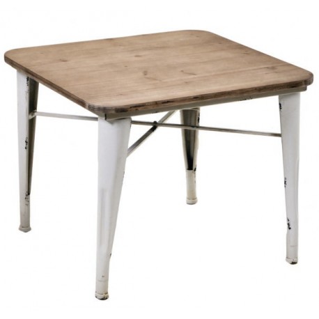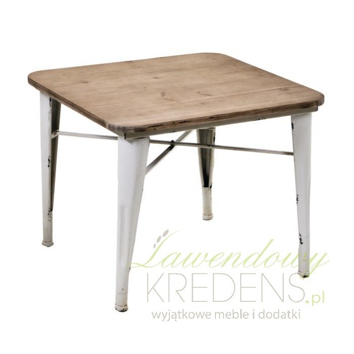 Metalowe meble takie jak stoliki kawowe, proponujemy szczególnie wnętrzom loftowym i industrialnym. Kwadratowy stolik kawowy ma drewniany blat w kolrze ciepłego brązu i białe, poste nogi. Postarzenia widoczne w szczególności na nogach wpisują mebel w kanony stylu industrialnego. Dwuklorowy stolik możesz śmiało zestawić z tapicerowaną kanapą w czarnym lub białym kolorze.