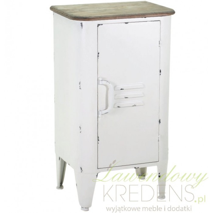 Szafka loftowa wykonana jest z wysokiej jakości metalu i drewna. Metalowa szafka ma śliczny, biały przecierany kolor i brązowy blat. Stoi na krótkich nogach i świetnie się prezentuje. Metalowe meble idealnie nadają się do ogrodu.