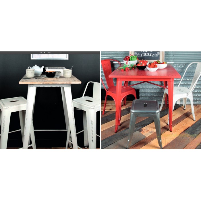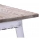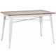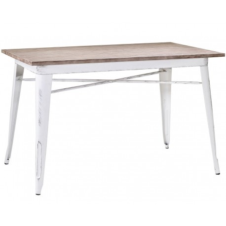 Stół industrialny ma standardowe wymiary i prostokątny kształt. Nogi mają biały mocno przecierany kolor, a blat jest brązowy. Meble loftowe oraz metalowe meble są idealne na rodzinne spotkania.