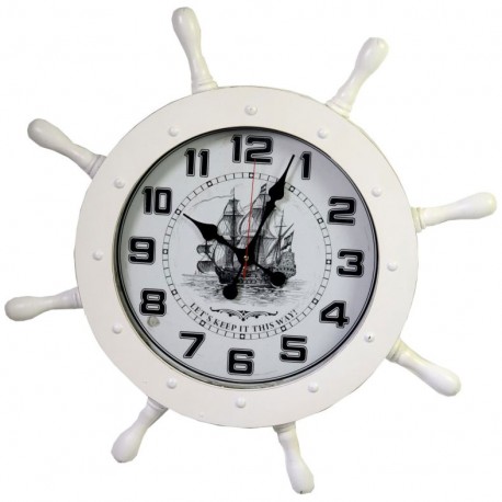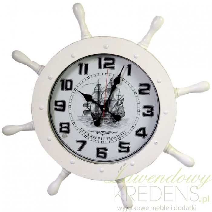 Zegar w stylu marynarskim wyglądający jak ster dużego statku będzie z pewnością wyróżniał się spośród innych dekoracji. Tarcza ma biały kolor i grafikę biało-czarnego statku pośród fal. Czarne cyfry i czarne wskazówki precyzyjnie odmierzają czas, a ich czarny kolor ułatwia odczytanie godziny. Zamów zegar marynarski ze statkiem, świetny również na prezent dla bliskiego przyjaciela. Zegary ścienne polecamy dla dobrze zorganizowanych i tych mniej!