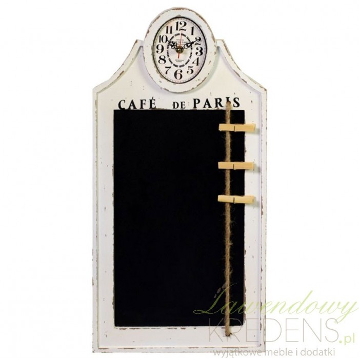 Tablica do pisania kredą dodatkowo posiada zamontowany mały zegar i klipsy. Takie połączenie jak zegar z tablicą możesz wykorzystać w takich wnętrzach jak restauracje, bary ale też w zwykłej, domowej kuchni. Tablica jest oprawiona w ramę z drewna. Rama pomalowana na biało wraz z napisami i przetarciami będzie pięknie współgrala z innymi dodatkami prowansalskimi. Zegary ścienne z tablicą są bardzo praktyczne.