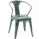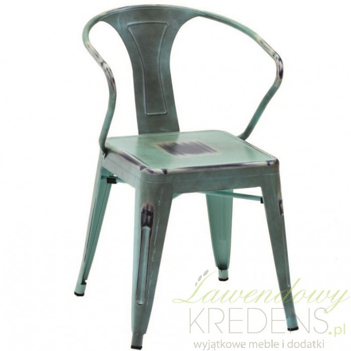 Krzesła w stylu industrialnym w zielonym kolorze zrobiono z metalu. Co je wyróżnia? To celowo wykonane postarzenia w formie odprysków i rdzawych plam.