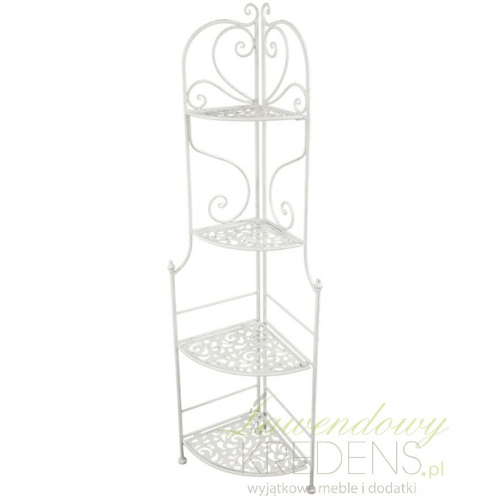 Piękny metalowy regał w stylu prowansalskim wygląda jak uformowany z kutego żelaza. Tylnia ściana i półki zostały wykonane w kształcie esowatych dekorów i w całości pokryte białą farbą. Regał prowansalski ma za zadanie zdobić wnętrze nadając mu klimat francuski i retro. Meble prowansalskie wyglądają przepięknie i rewelacyjnie pasują do kuchni lub łazienki.