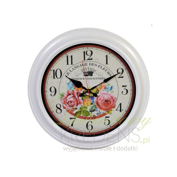 Okrągły zegar z różami ma białą ramę z metalu. Zamiłowanie włoskiej marki do stylu prowansalskiego o sprawiło, że powstały urocze zegary z różami. Zegar prowansalski polecamy do wnętrz każdego typu, ten element wyposażenia jest wzorowym przykładem praktycznego i dekoracyjnego dodatku. Świadczy o tym przede wszystkim tarcza z czarnymi wskazówkami przyslaniajacymi francuskie napisy i koronę.