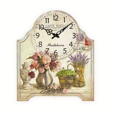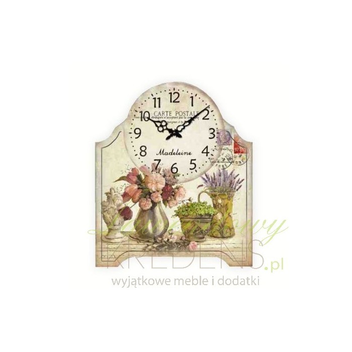 Prowansalski zegar stojący wykonany z MDF na który nalepiony został specjalny nadruk. Na nadruku widnieje piękny, prowansalski wzór z lawendą oraz różnymi kwiatami w wazonach. W prawej częśći zegara znajdują się także motywy pieczątek dodające zegarowi francuskiego sznytu. Stojące zegary w stylu prowansalskim występują w różnych wzorach, świetnie sprawdzą się postawione na szace czy komodzie.