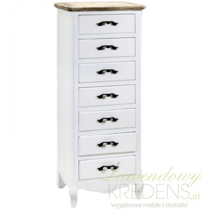 Komoda w stylu prowansalskim to wysoki mebel wykonany z drewna jodłowego będący ukłonem w stronę funkcjonalnego wnętrza dzięki ośmiu szufladom.