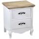 Nocna szafka w stylu prowansalskim o białym, matowym kolorze i brązowym blacie. W dolnej części szafki znajduje się delikatne rzeźbienie.