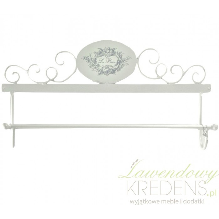Prowansalski wieszak na ręczniki „Le Bain”, wykonany z metalu w jasnym kolorze, pomoże stworzyć wnętrze eleganckie i stylowe. Dekoracyjna forma odpowiednia będzie do wnętrz w stylu francuskim i prowansalskim. Wieszak w stylu prowansalskim pasuje także do tradycyjnych wnętrz w białych kolorach, jak również łazienek w stylu klasycznym, pełnych mozaik i wyrazistych kolorów. Wieszak tworzy pojedynczy pręt, owalna tabliczka z francuskim napisem Le Bain i metalowe, fantazyjnie wygięte dekoracje.