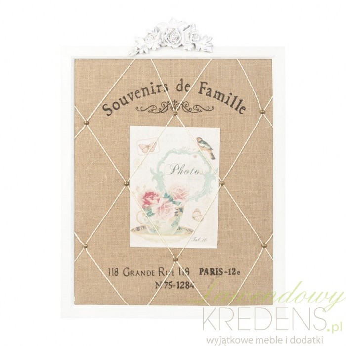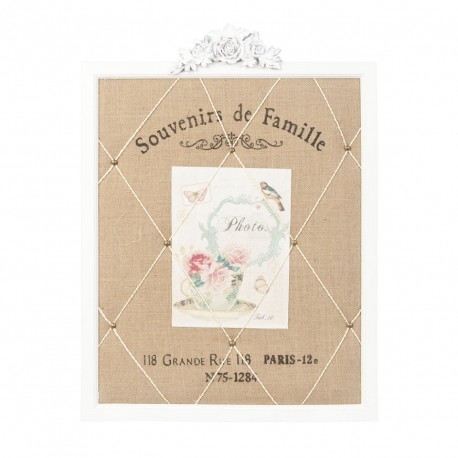 Jeśli zaczynają Cię drażnić porozrzucane wokół notatki i nietrakcyjnie wyglądająca przestrzeń wokół biurka to mamy dla Ciebie coś specjalnego! Prowansalska tablica na zdjęcie i notatki rozprawi się w mig z każdym rozgardiaszem. Tablica na zdjęcia oprawiona jest w białą ramkę z rzeźbioną dekoracją na górze i przeszywana jasnymi nićmi tworzącymi dekoracyjne romby. Tablica okryta jest materiałem w kolorze beżowym i ozdobiona ciemnymi napisami francuskimi. Postaw na dodatki prowansalskie do pokoju od Clayre&Eef.