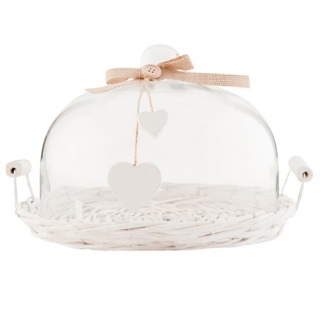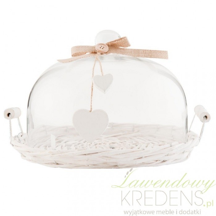 Wiklinowa taca ze szklanym kloszem, na czubku którego została przywiązana kokardka z wiszącymi serduszami!