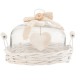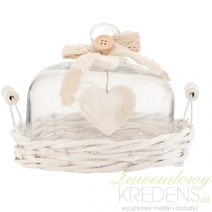 Okrągła taca wiklinowa z przeźroczystym kloszem ma dwa uchwyty po bokach wyposażone w drewniane rączki. Wklinowy koszyk wykonano z jasnych włókien wiklinowych. Szklaną pokrywę ozdobiono koronkową kokardą z guzikiem oraz zawieszką w kształcie serca. Tace z kloszem są jednymi z najpraktyczniejszych dodatków do kuchni, wykorzystywanymi by zachowywać na dłużej trwałość pieczywa i chrupkość ciasteczek.