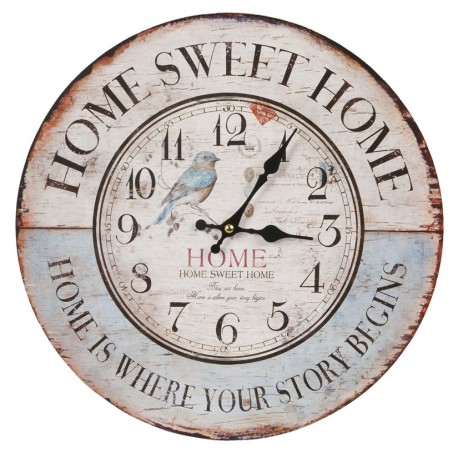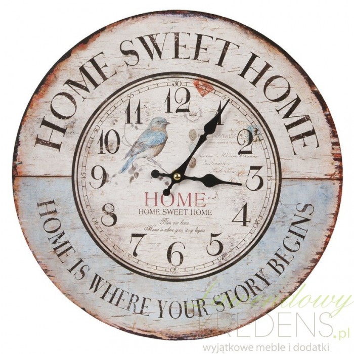 Prześliczny zegar prowansalski Sweet Home w którego dolnej części znajduje się urocza sentencja. Środek zegara ozdobiony jest motywem ptaszka, który swym błękitnym kolorem nawiązuje do dolnej części zegara. Na około, wzdłuż swoich krawędzi, zegar posiada imitacje przetarć w stylu vintage.