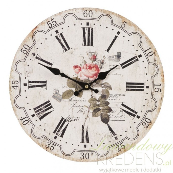 Okrągły zegar prowansalski zawdzięcza swój urok kwiatowej grafice na postarzanej tarczy. Na tarczy zegara dostrzec można również znikające napisy francuskie oraz pieczęcie. Jeżeli dla Ciebie styl prowansalski to zupełnie nowy motyw koniecznie wypróbuj jak sprawdzi się w Twoim wnętrzu. Zegary ścienne takie jak zegary w stylu prowansalskim nadają wnętrzom zupełnie nowego charakteru.