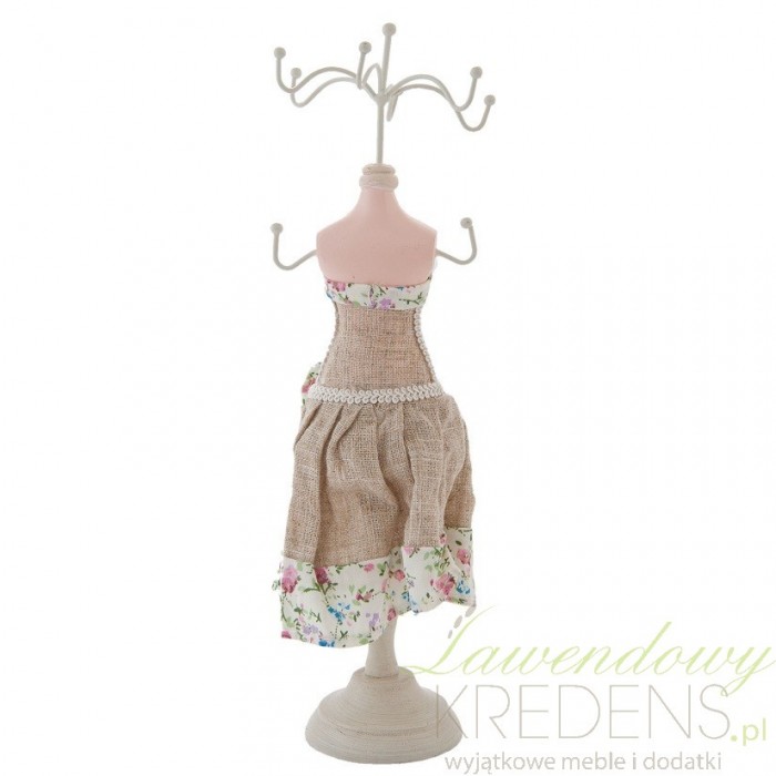 Stojak na biżuterię firmy Clayre & Eef to połączenie uroczego wieszaczka z postacią manekina. Manekin na biżuterię ma cudowną beżową sukienkę z motywem w kwiaty, która wspaniale się prezentuje. Stojak jest drewniany i ma jasny, uniwersalny kolor. Stojaki na biżuterię to marzenie każdej kobiety.
