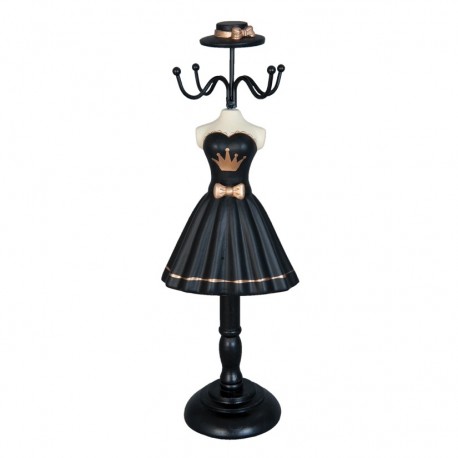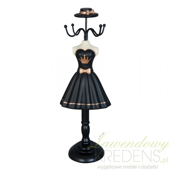 Oryginalny stojak na biżuterię, który pomoże utrzymać porządek w łańcuszkach czy też bransoletkach. Manekin na bizuterię, który został ubrany w czarną szukienkę ze złotą koroną i czarnym kapeluszem na pewno zadowoli wszystkie Panie. Stojaki na bizuterię to oryginalny pomysł na prezent.