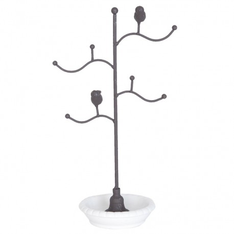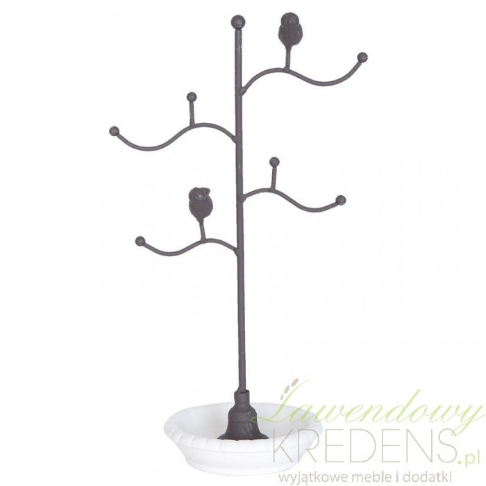 Stojak na biżuterię wykonany jest w kształcie drzewa z gałęziami, które są jednocześnie miejscem do wieszania biżuteri. Ustawiony w białej podstawie prezentuje się lekko i dekoracyjnie. Na dwóch gałęziach manekin na biżuterię ma zamocowane dwa małe ptaszki. Stojaki na biżuterię pomogą Ci odpocząć od pomieszanych łańcuszkow i innej biżuteri.