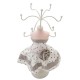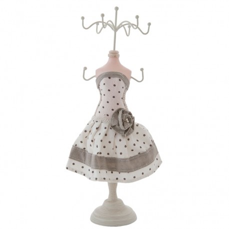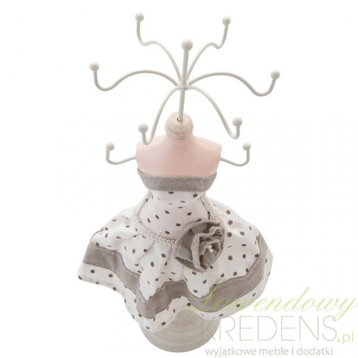 Manekin na biżuterię to poprostu stojak na biżuterię, który jest praktycznym dodatkiem w pastelowej palecie barw. Został wykonany na podstawie z drewna i posiada metalową karuzelę z haczykami do wieszania biżuteri. Kobiecy charakter nadaje stojakowi urocza sukienka z koronką. Dodatki w stylu prowansalskim od Clayre&Eef to również dobrej jakości stojaki na biżuterię.