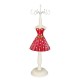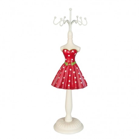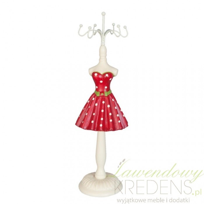 Stojak na biżuterię z sześcioma haczykami, na których można zawiesić łańcuszki lub bransoletki. Manekin na biżuterię z ozdobną czerwoną sukienką w białe kropeczki. Stojaki na bizuterię to fantastyczne dodatki dla każdej z Pań.