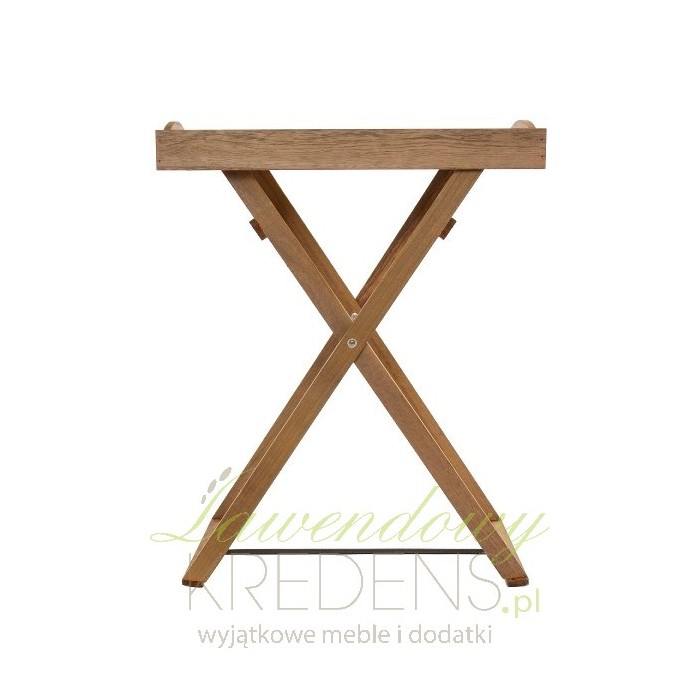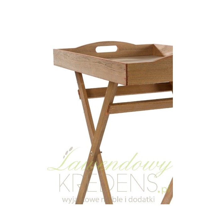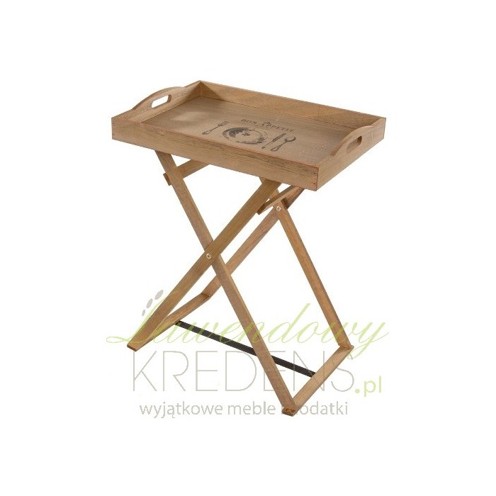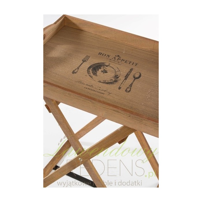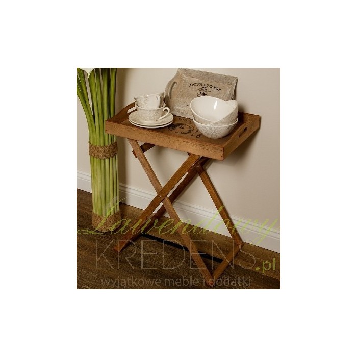 Piękny, drewniany stolik z tacą na której znajduje się ciemna grafika. Stolik taca to praktyczny mebel do kuchni lub ogrodu, sprawdzi się na pewno w czasie rodzinnych spotkań.