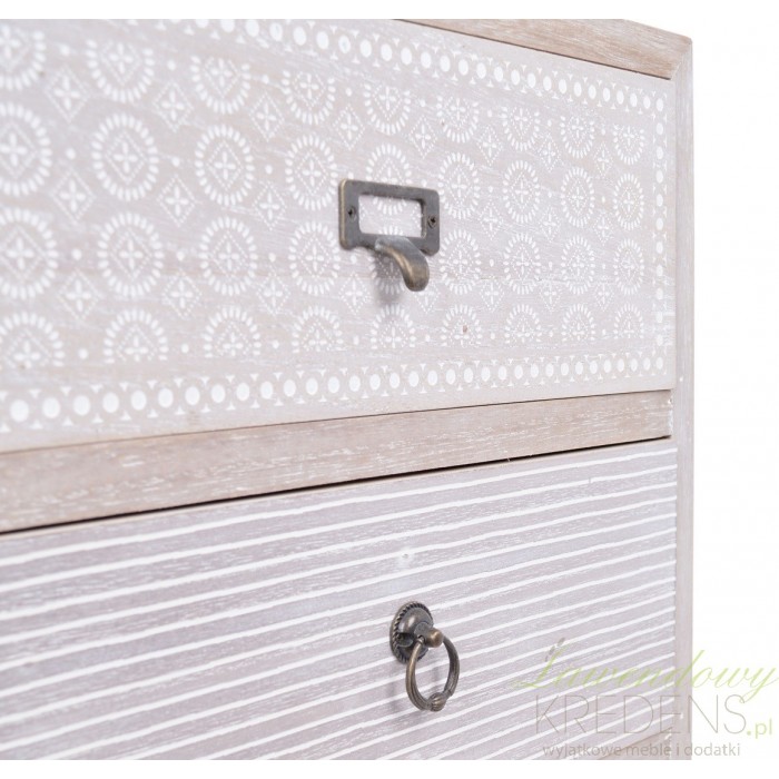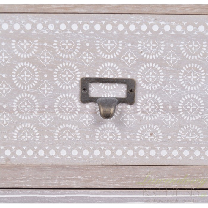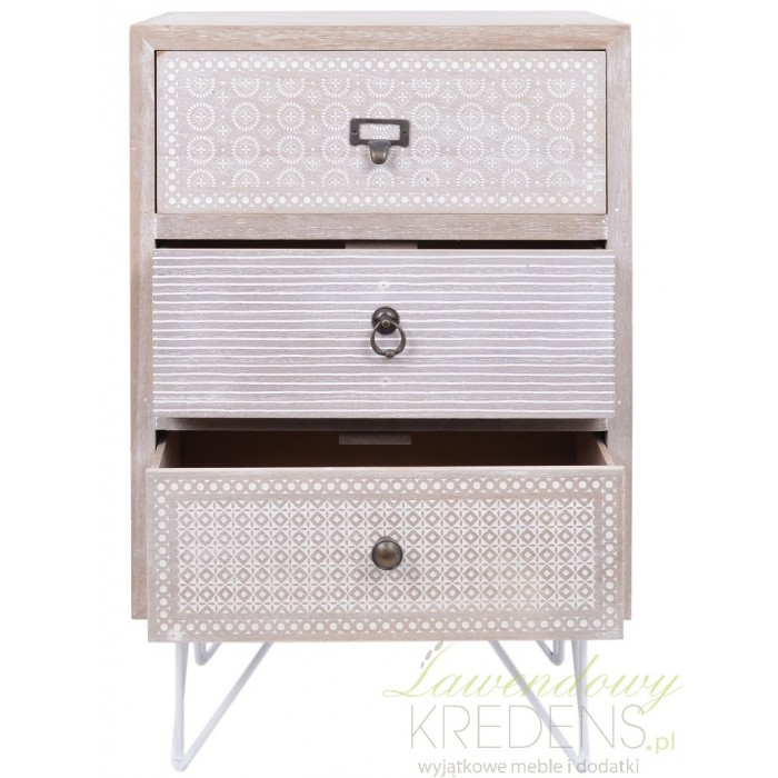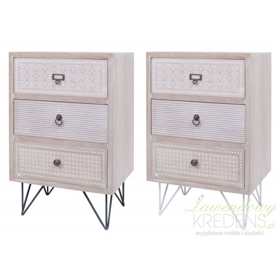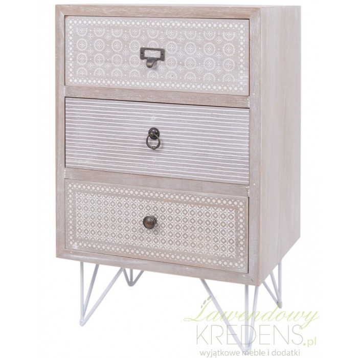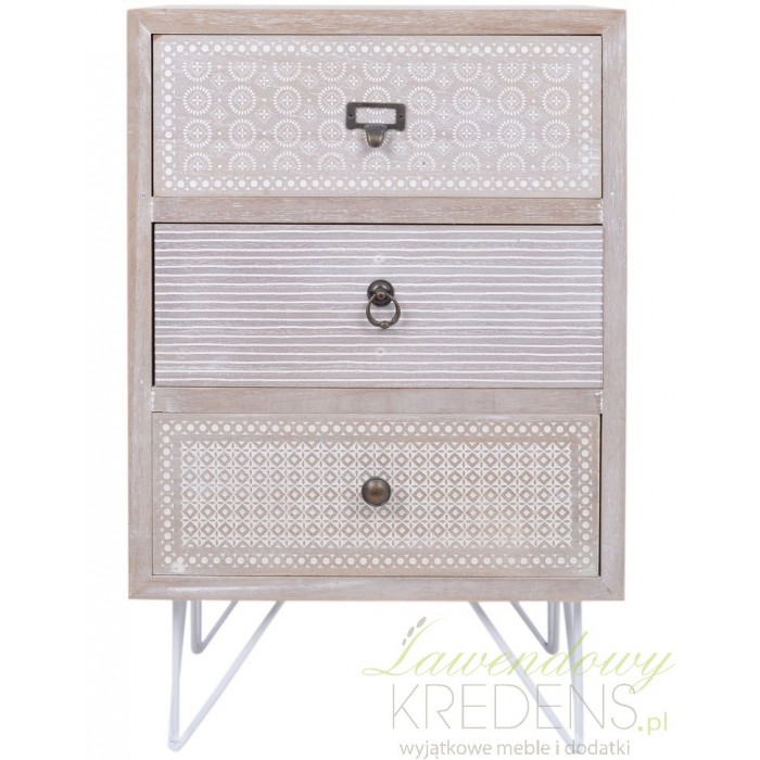 Szafka nocna w jasnym szaro-brązowym kolorze jest ozdobiona białymi wzorkami. Białe wzorki w różnej konfiguracji zdobią każda z trzech szuflad szafki nocnej. Szafka retro ma metalowe nogi oraz trzy metalowe uchwyty przy szufladkach. Zamiłowanie holenderskiej marki do stylu retro pozwoli ci stworzyć sypialnię jak że snu. Wystarczy wybrać meble retro.