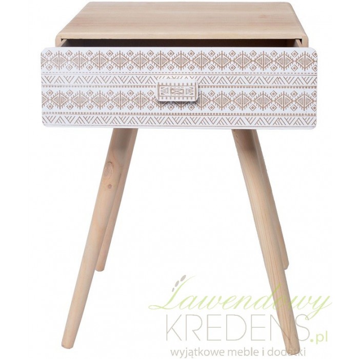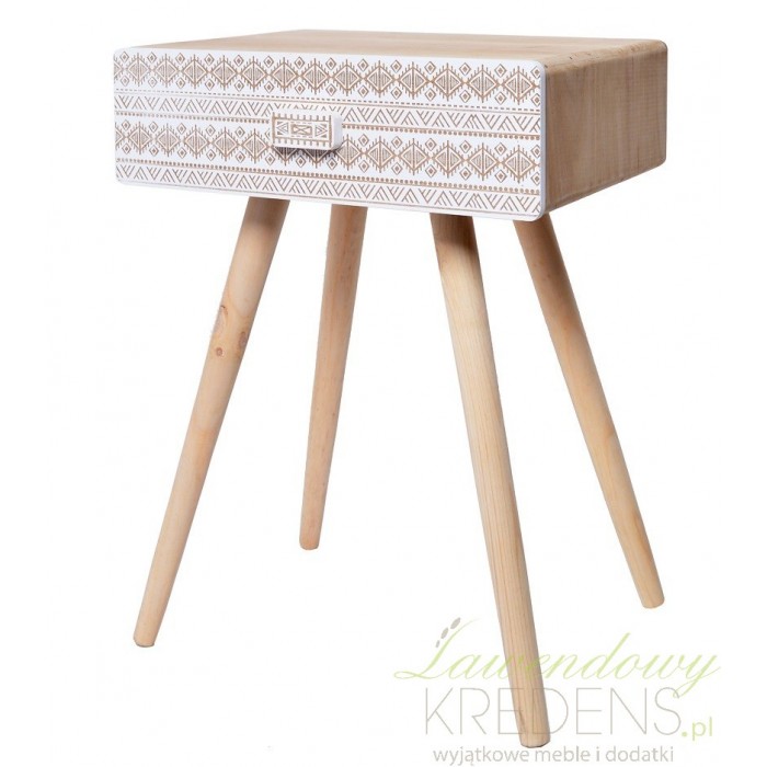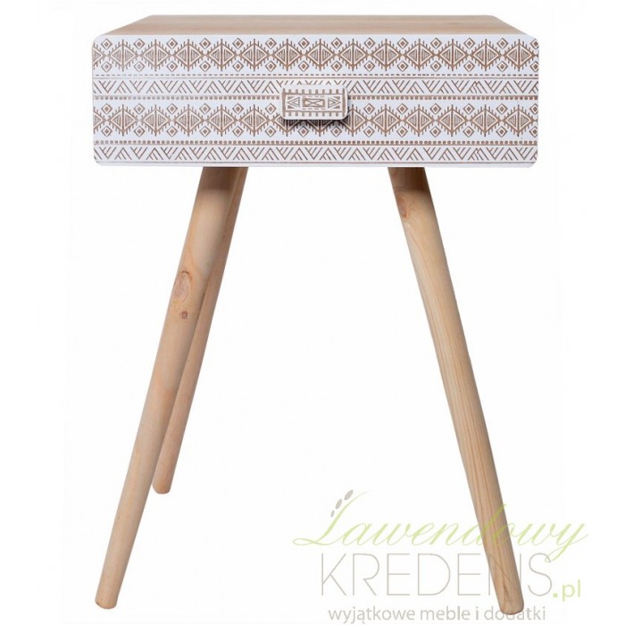 Meble retro to obdarzone wyjątkowym designem elementy wyposażenia sypialni. Przykładem są stoliki nocne z najnowszej kolekcji jaką prezentujemy na naszej stronie. Stolik nocny z szufladą ozdobioną wzorem etnicznym w czerwonym kolorze na jasnym tle to mebel z duszą. Ustawiony na prostych drewnianych nogach będzie dumnie zdobił twoją sypialnię lub pokój gościnny.