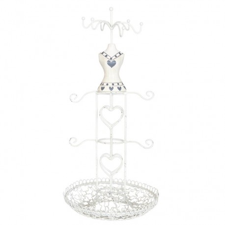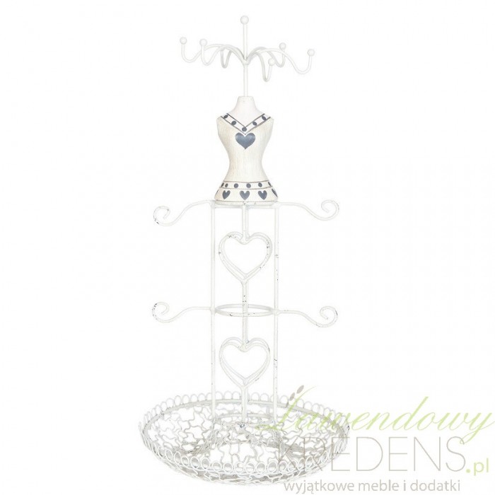 Białe stojaki na biżuterię Clayre & Eef wykonane są z metalu z drewnianym korpusem. W dolnej części stojaczki posiadają ażurową, metalową tackę idealną na przykład na pierścionki, natomiast wyżej, po bokach znajdują się cztery wieszaczki, a w górnej części stojaczka dodatkowo sześć haczyków. Nasze stojaczki na biżuterię to nie tylko przedmioty praktyczne, ale także dekoracyjne dodatki w stylu prowansalskim, które dzięki swemu urokowi ozdobią każdą sypialnię, łazienkę czy też garderobę.