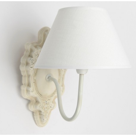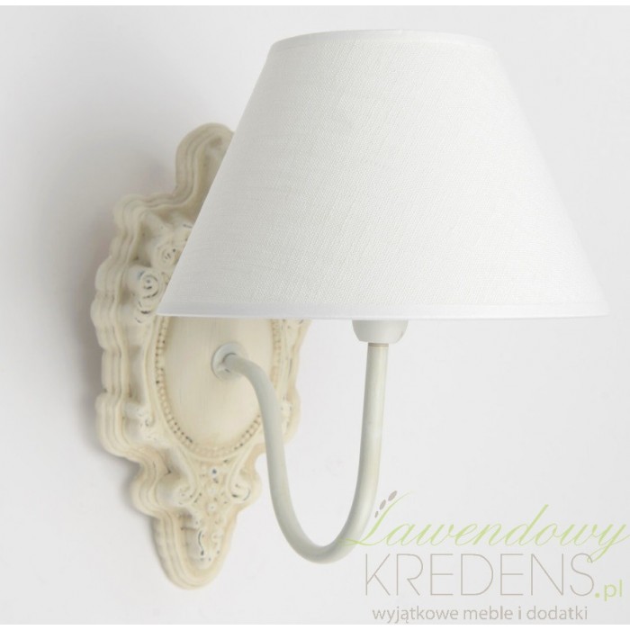 Podstawa kinkietu wykonana została z drewna i ma kształt zbliżony do owalu z falistą, dekoracyjną krawędzią. Z podstawy odchodzi metalowy uchwyt zagięty ku gorze, na zakończeniu którego znajduje się gwint i nałożony na niego abażur. Abażur ma klasyczny kształt stożka i biały kolor. Kinkiety prowansalskie, którch znajdziesz w naszym sklepie co nie miara to sposób na aranżację korytarza, salonu, a nawet pokoju dziecięcego.