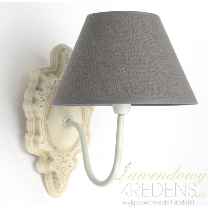 Kinkiet prezentuje się kapitalnie dzięki rzeźbionej podstawie w kolorze kremu. To ona odpowiada za styl prowansalski, natomiast szary klosz w nieco bardziej klasycznej wersji nadaje mu stonowanego charakteru i elegancji. Kinkiet w stylu prowansalskim warto przeznaczyć do oświetlenia różnego typu wnętrz jeśli tylko chcemy by prezentowały się elegancko. Szaro-kremowe kinkiety prowansalskie zdecydują o ostatecznym wyglądzie aranżacji.