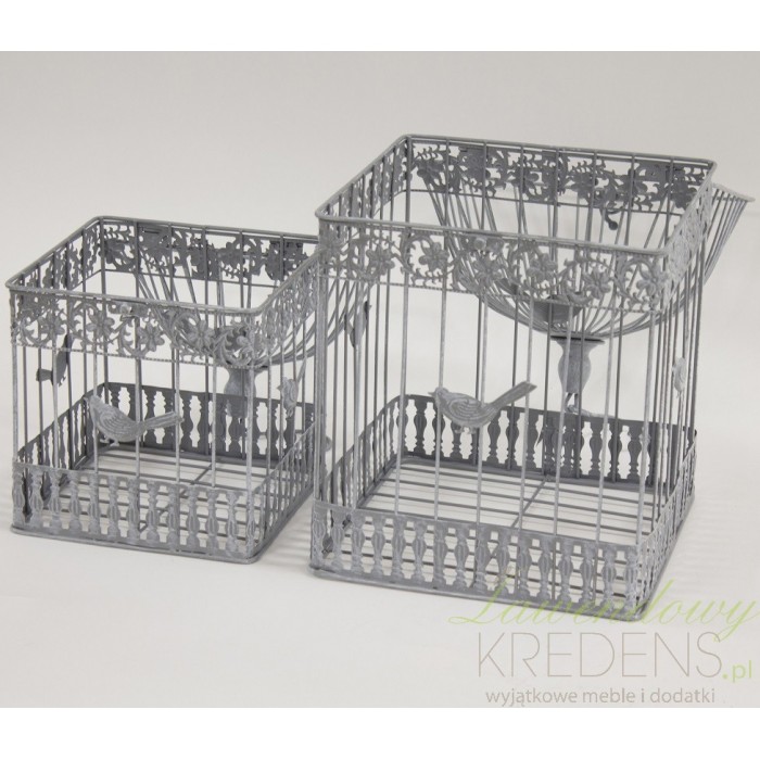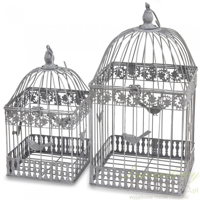 Dwie klatki ozdobne to już coś! Szare, wykonane z metalu i opatrzone francuskim wzornictwem genialnie sprawdzą się w roli nietypowego kwietnika, lampionu, a nawet wolnostojącej dekoracji. Daj się oczarować prowansalskim dekoracjom i poczuj klimat śródziemnomorskiej przygody w swoim domu. Szare klatki z ozdobnymi detalami takimi jak francuskie wzory i małe ptaszki na bokach klatki tylko podkreślają styl prowansalski dekoracji.