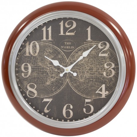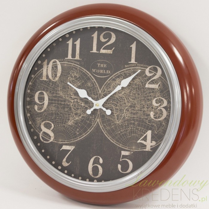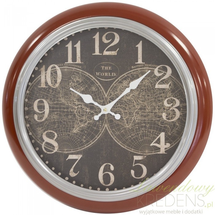 Zegary retro nie muszą prezentować się idealnie gładko i nieskazitelnie. Wręcz preciwnie - zegary ścienne w stylu retro to przede wszystkim postarzenia. Zegar retro z ciemną tarczą ma nadruk w kształcie mapy świata i jasne, wyróżniające się białe cyfry. Jego naturę retro podkreśla bordowa rama.