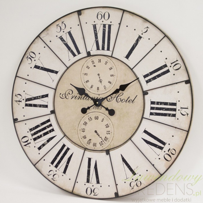 Przepiękne, duże zegary ścienne w prowansalskim stylu, których średnica wynosi aż 80cm. Tarcza ozdobiona jest metalową ramką, która także oddziela od siebie godziny. Dzięki temu godziny na zegarze są bardzo czytelne. Dwa mniejsze zegarki znajdujące się na środku tarczy udają sekundniki i pełnią wyłącznie ozdobną funkcję.