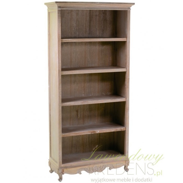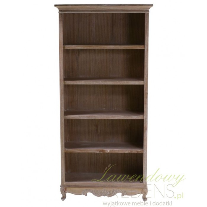 Piękny, widocznie pobielony regał prowansalski jest idealny do salonu, pokoju gościnnego, a nawet do sypialni! Bielony regał posiada cztery solidne półki, a pod nimi ozdobne rzeźbienie akcentujące styl francuski. Krótkie nóżki są również rzeźbione i zaokraglone. Meble bielone Bienni polecamy wszystkim miłośnikom francuskiego i prowansalskiego stylu.
