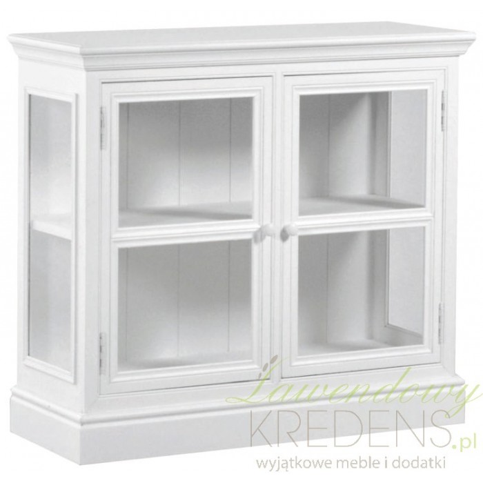 Komoda prowansalska ma prosty kształt, przeszklone drzwi i śnieżnobiały kolor. Boki komody również są przeszklone, dzięki czemu jej zawartość jest doskonale widoczna z każdego miejsca w salonie. Para szklanych drzwi jest dodatkowo przedzielona na pół i ma na każdym skrzydle po jednej, małej gałeczce. Meble prowansalskie takie jak niska witryna z kolekcji Lenti, to meble godne ekspozycji wartościowych przedmiotów.