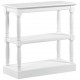 Biała konsola w stylu prowansalskim posiada praktyczną półkę i jest stabilnie ustawiona na zabudowanej podstawie.