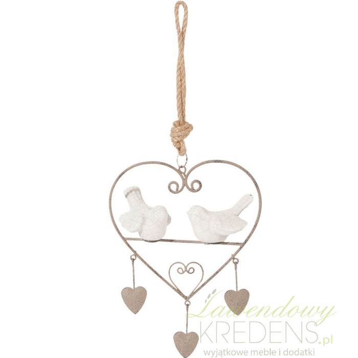 Pełna prowansalskiego uroku zawieszka ozdobna w kształcie serca. Zawieszka ma beżowy kolor i jest zrobiona z metalu, w jej dolnej części znajdują się trzy mniejsze serduszka, a w środku zawieszki, niczym na gałęzi, siedzą dwa ceramiczne, białe ptaszki. Do zawieszenia dekoracji służy parciany sznureczek dołączony do zawieszki.