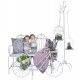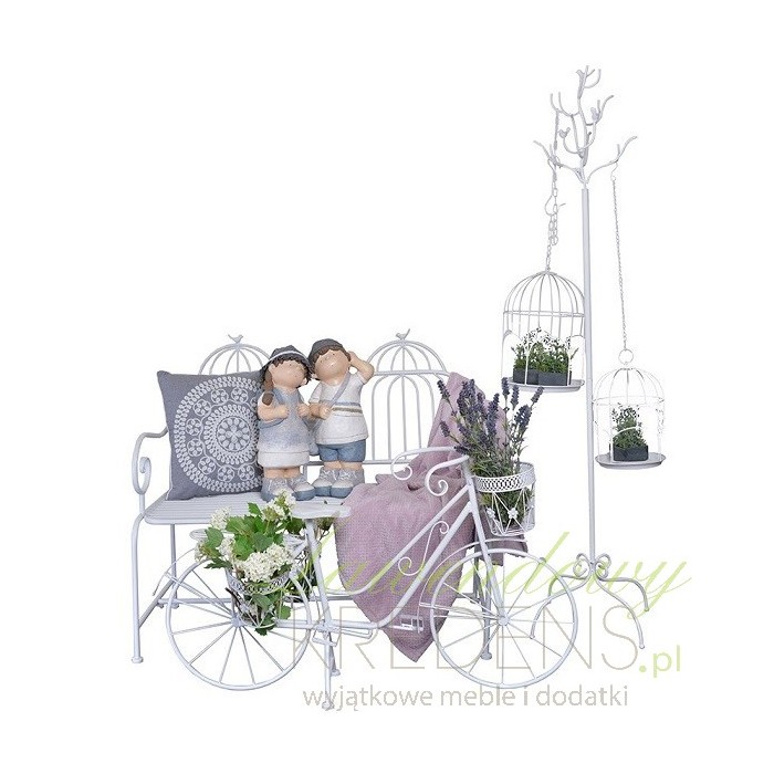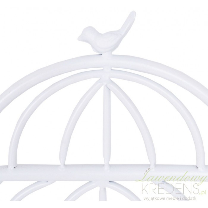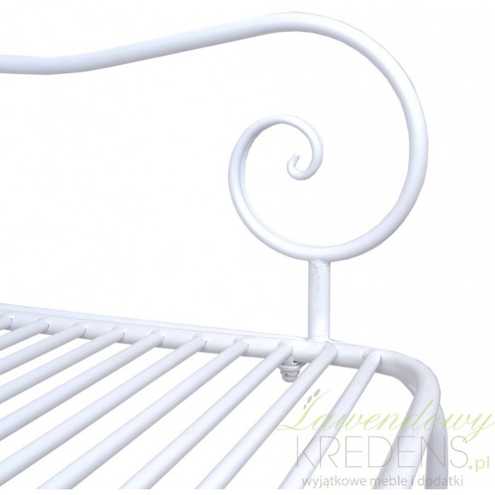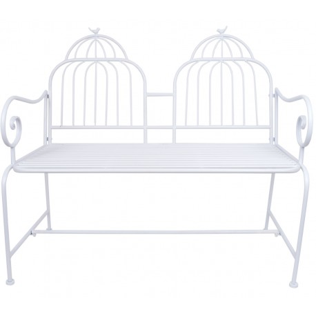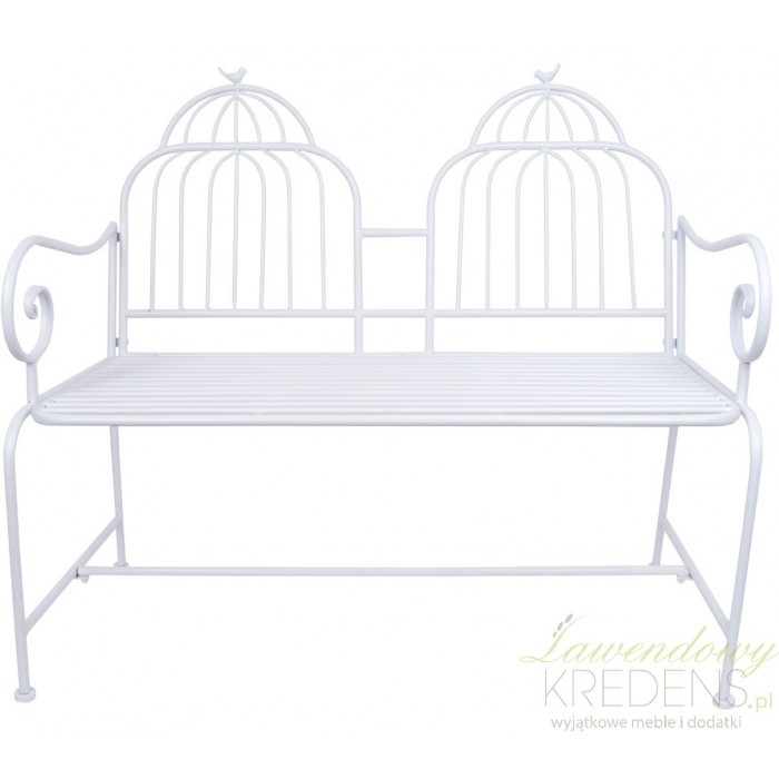 Biała, dwuosobowa ławka w stylu prowansalskim wykonana z metalu. Siedzisko ławki wykonane jest z drążków natomiast oparcie jest inspirowane kształtem klatek dla ptaków. Wierzchołki oparcia są ozdobione metalowymi figurkami ptaszków. Ławka świetnie sprawdzi się na balkonie, zadaszonym tarasie czy też werandzie. Poza sezonem, dzięki możliwości złożenia na płasko, ławkę można natomiast wygodnie przechowywać.